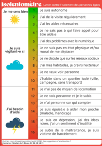 L’Isolentomètre est un outil de prévention et de sensibilisation conçu pour repérer l’isolement social des seniors. Grâce à une présentation sous forme de baromètre de couleurs, il permet d’évaluer le niveau d’isolement d’un senior, de faciliter l’échange et d’encourager la prise de conscience.
