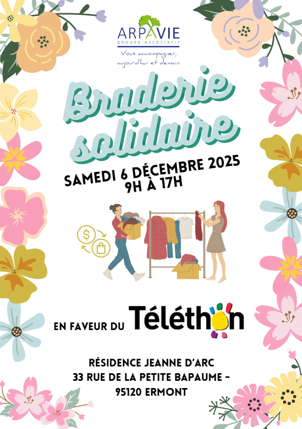 Pour la 2e année consécutive, les résidents et le personnel de la résidence ARPAVIE Jeanne d'Arc se mobilisent pour organiser une BRADERIE SOLIDAIRE en faveur du TELETHON. Venez nombreux le samedi 6 décembre 2025 de 9h00 à 17h00.