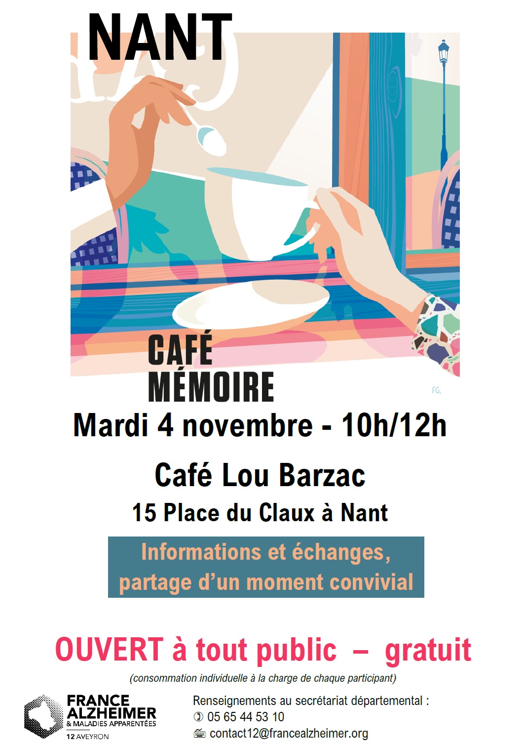 France Alzheimer Aveyron propose un temps d’information, d’écoute et de partage lors d’un café mémoire ouvert aux personnes malades et leurs proches aidants, ainsi qu’à toute personne intéressée par les troubles de la mémoire.
