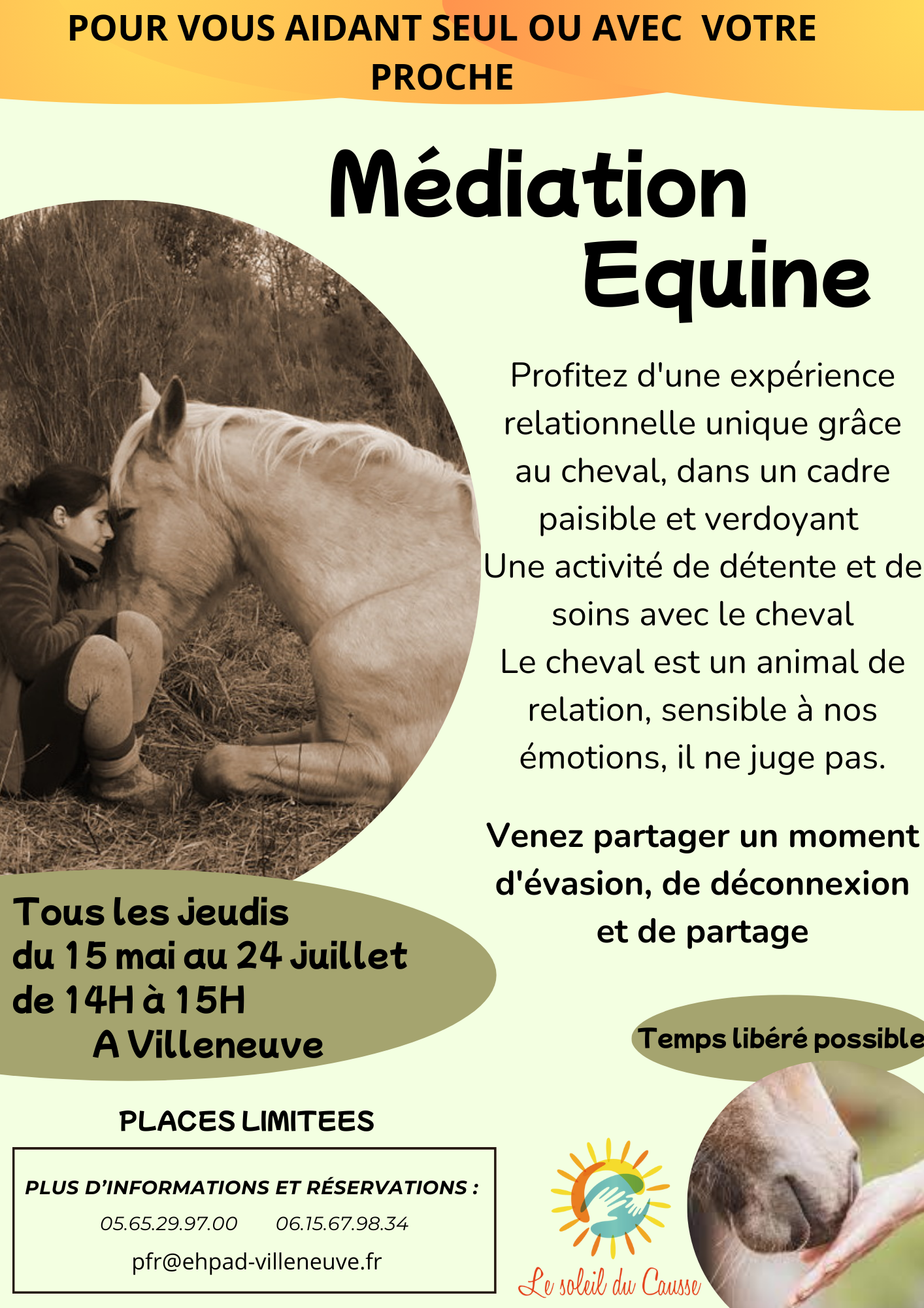 Séances hebdomadaires de médiation équine à Villeneuve à destination des aidants accompagnés ou non d eleur proche.